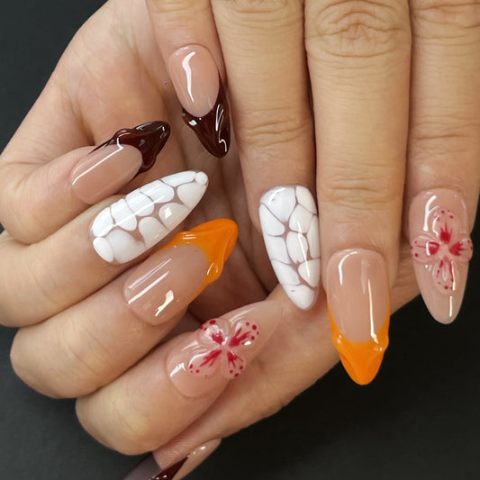 Multi-Style Press-On Nails – Nude Base with Burgundy Blends, Orange Gradient, Pebble Texture & 3D Pink Floral Design, Elegant & Artistic(K20))