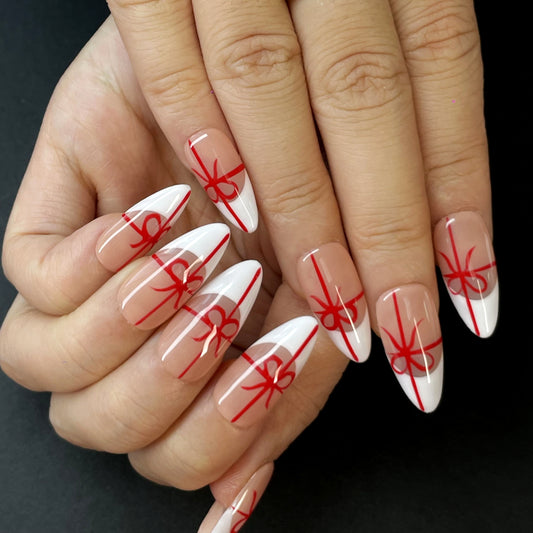 French Style Press-On Nails – Nude Base with White Tips, Red Bow and Line Art Accents, Sweet and Elegant Design for a Feminine Look(K22)