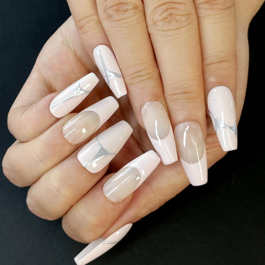 Minimalist Press-On Nails – Ivory & Light Gray with Silver Line Accents, Elegant and Fashionable Design for Everyday Chic Looks(K25)