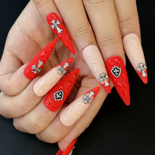 Gothic Stiletto Press-On Nails – Red & Beige with Drip Texture, 3D Droplets, Silver Cross & Shield Charms for a Dark, Edgy Look(K27)