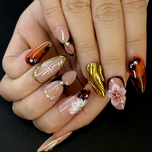 Almond Press-On Nails – Nude Pink with Brown Leopard Print, Gold Edges, Gems & 3D Flowers, Elegant Japanese-Inspired Design for Daily or Formal Wear(K29)