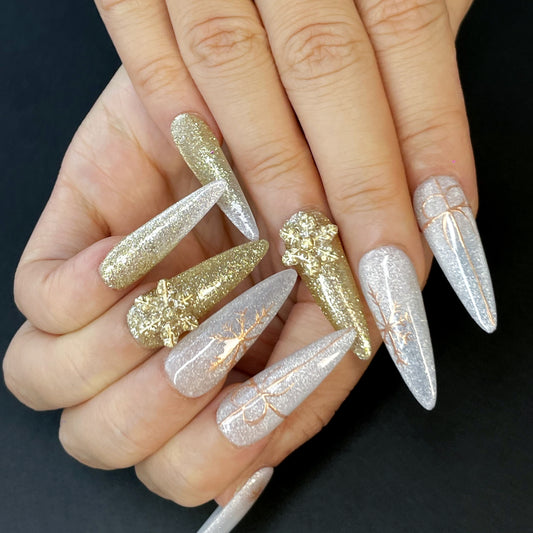 Stiletto Press-On Nails – Silver & Gold with Glitter, Snowflakes & Bows, 3D Holiday Design for Glamorous Winter Parties & Festive Looks(K30)