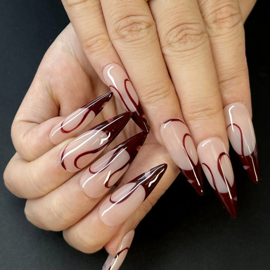 Almond Press-On Nails – Nude Pink & Deep Red with Irregular Line Design, Stylish and Bold Look for Parties and Casual Chic Occasions(K32)