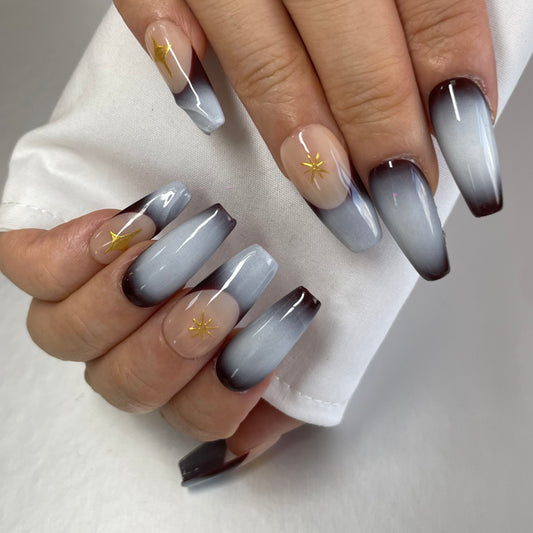 Mystical Glam Long Nails – Gradient with Gold Celestial Design(K40)