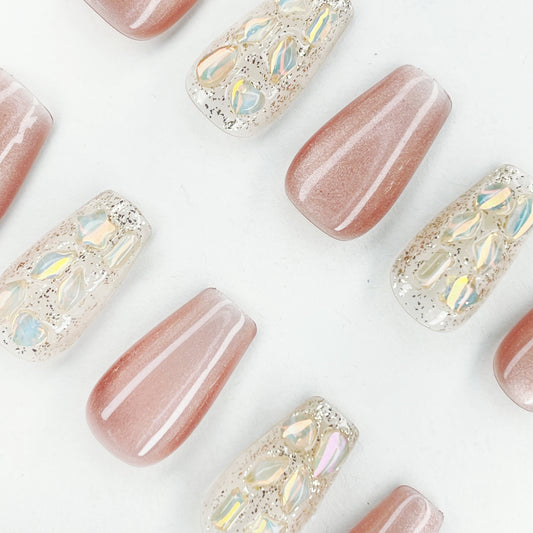 Nude Pink Glitter Press-On Nails with Rhinestones & Shell Accents – Elegant, Layered Luxury Look”(266)