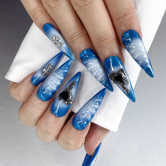 Mystic Cat-Eye Nails | Blue-White Gradient with Gothic Charms(K36)