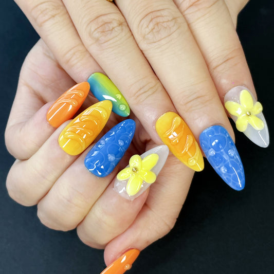 Colorful Summer Press-On Nails – Almond Shape with 3D Yellow Flowers, Dots & Texture | Bright, Playful Vibes(K10)