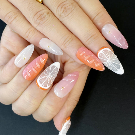 Lemon-Inspired Press-On Nails – Almond Shape with Citrus Art, Pink & Peachy Shades, 3D Texture & Sparkling Gold Accents(K11)