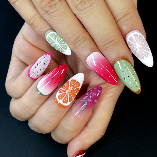 Mixed Fruit Press-On Nails – 3D Embossed Almond Shape with Grapes, Oranges, Watermelon & More | Sweet & Fresh Summer Vibe(K12)
