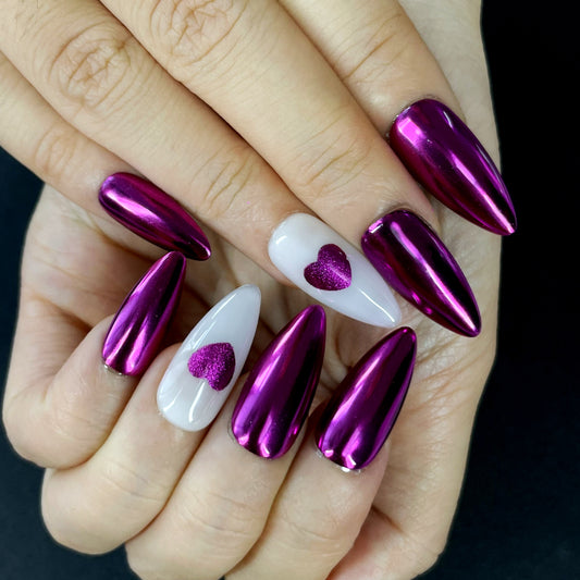 Metallic Rose Pink Almond Press-On Nails with White Accent & Heart Detail | Bold, Sweet & Edgy Nail Style(K14)