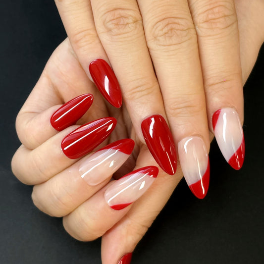 Red & White Stiletto Press-On Nails – Bold Color with Geometric Split Design | Elegant, Striking & Fashion-Forward Look(K15)