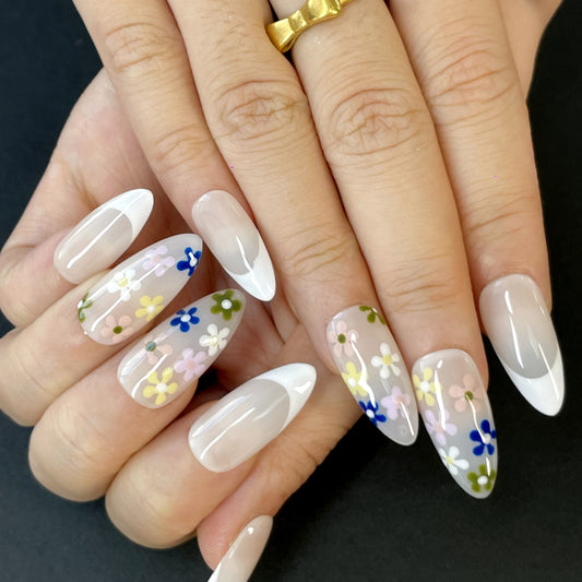 Floral French Press-On Nails – Almond Shape with Soft Grey Base, White Tips & Colorful Hand-Painted Flowers | Sweet Everyday Style(K16)