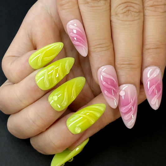 Dual-Tone Press-On Nails Set – Pink Gradient & Neon Green with 3D Lines and Dots, Trendy & Eye-Catching Design for Stylish Looks(K17)
