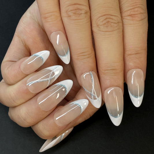 French Style Press-On Nails – Nude Beige Base with White Tips & Silver Glitter Lines, Elegant and Trendy Design for Any Occasion(K18)