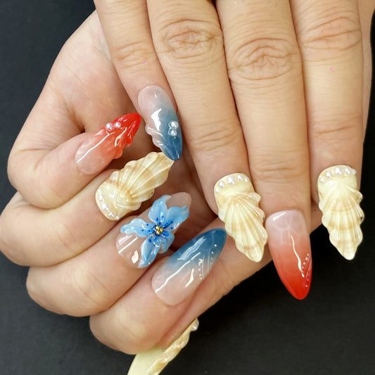 Summer Vacation Press-On Nails – Almond Shape with Seashell Accents, Pearls & Floral Designs in Red/Blue/Yellow-Gree(K4)