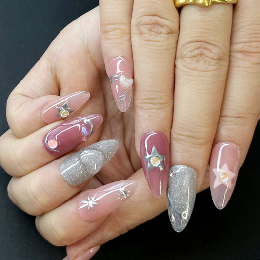 Sweet & Edgy Dreamy Press-On Nails – Long Coffin Shape in Pink, Silver & Purple with Stars, Hearts, Pearls & Glitter(K5)
