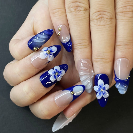 Butterfly & Floral Coffin Press-On Nails – Blue Nude Tones with 3D Details & Gold Beads for a Chic Artistic Look(K6)