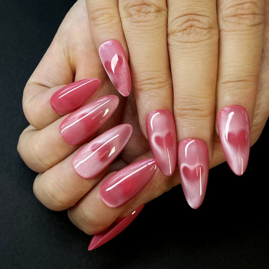 Pink Heart Press-On Nails – Long Almond Shape with Glossy Finish | Sweet & Romantic Look for Dates and Parties(K8)