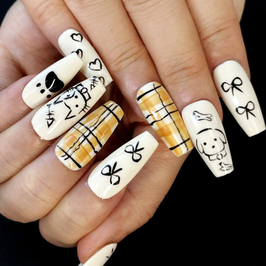 Animal Lover Press-On Nails – Long Coffin, Cream Base with Hand-Drawn Pets, Paws, Plaid & Cute Icons for a Fun Look(K9)