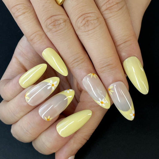 Floral Almond Press-On Nails – Light Grey & Yellow Palette with Delicate Blossoms | Clean(K13)
