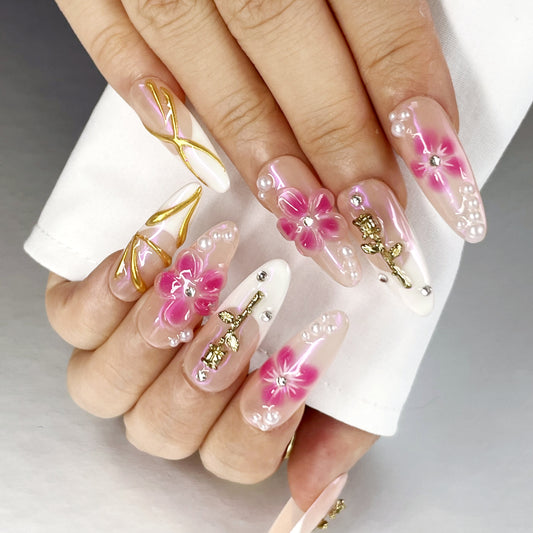 Elegant Romance: Nude-Pink Press-On Nails with Pearls & Florals(K59)