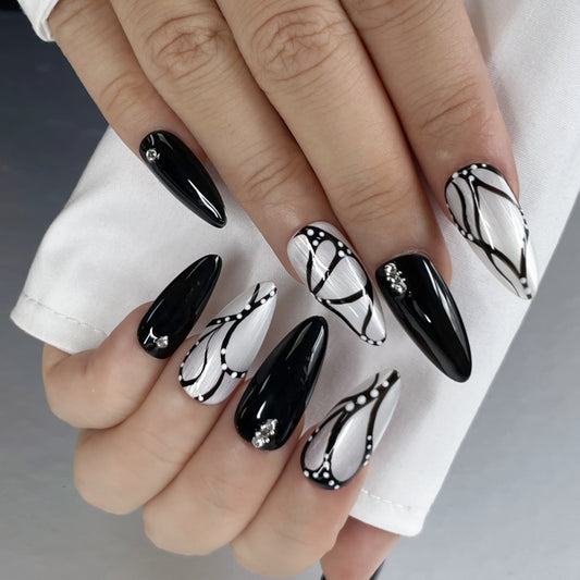 Elegant Long Nails – Minimalist Black & White with Sparkle(K64)