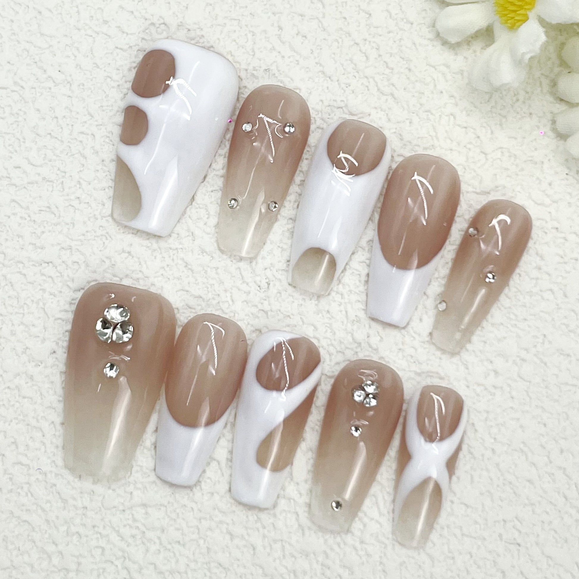 Coffin Press-On Nails – Nude Brown & White Gradient with Silver Rhinestones, Glossy Modern Design with Geometric Accents, Handmade(167)